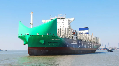 12月7日,由中国船舶集团有限公司旗下沪东中华造船(集团)有限公司联合中国船舶工业贸易有限公司为法国达飞集团建造的13000TEU液化天然气(LNG)双燃料动力大型集装箱船系列首制船“CMA CGM BAHIA”号,在中船长兴造船基地命名交付。这是继全球首创LNG双燃料动力23000TEU超大型集装箱船,沪东中华完工交付的又一款清洁能源集装箱船,持续巩固了其在大型、超大型双燃料动力集装箱船建造领域领军企业的地位。