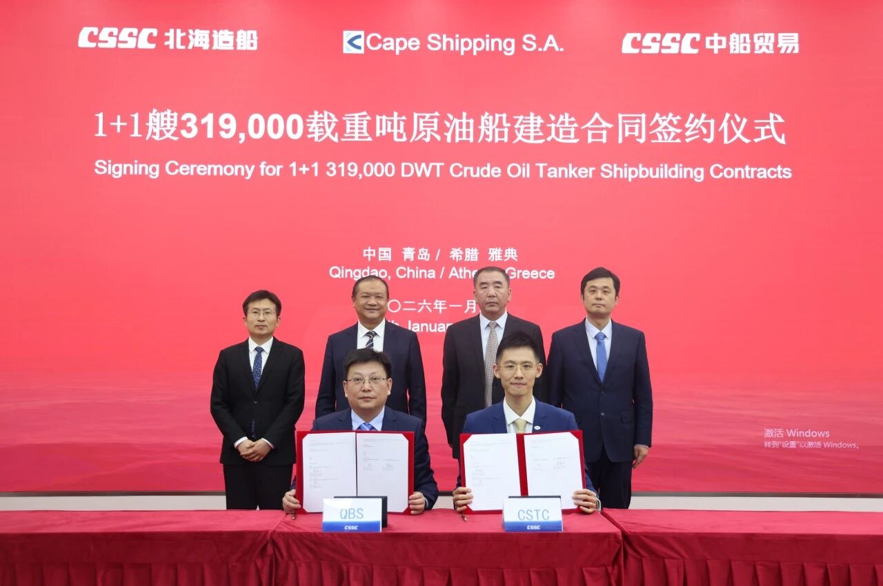 签约仪式在青岛与雅典同步举行,标志着北海造船在绿色大型油船建造领域再次取得重要突破,充分体现了船东对北海造船品牌与油船建造质量的高度认可,也进一步巩固和提升了中船集团在大型油船建造领域的市场份额与全球竞争力。