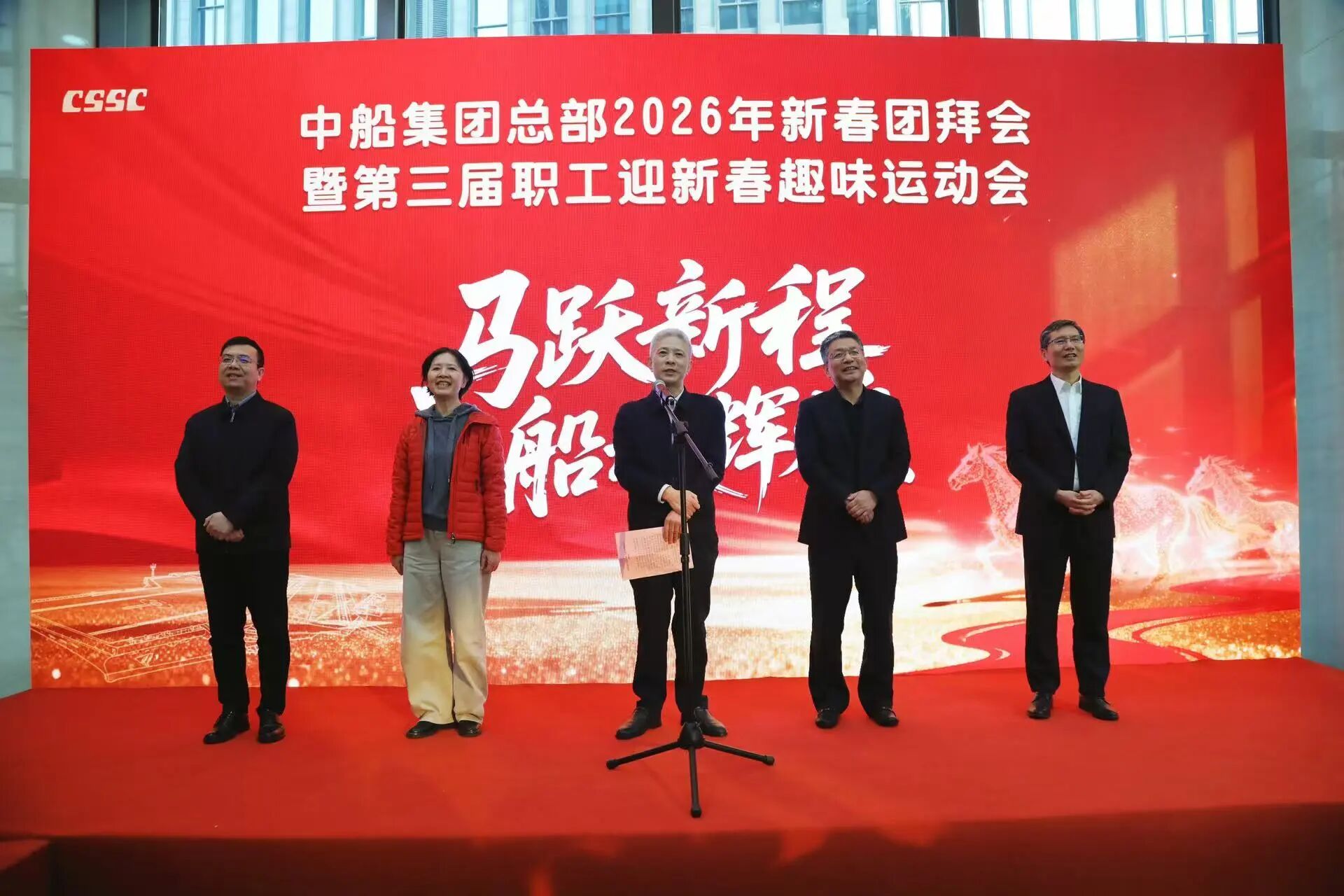金蛇辞岁,骏马迎春。在农历马年新春佳节来临之际,2月11日,中国船舶集团有限公司总部举行2026年新春团拜会暨第三届职工迎新春趣味运动会。中船集团党组书记、董事长徐鹏代表中船集团党组向辛勤耕耘、笃行实干的集团全体干部职工,向始终相伴、倾情付出的全集团家属们,致以最衷心的感谢和最诚挚的问候。党组副书记、董事、集团工会主席贾海英,党组成员、总会计师朱永红,党组成员、副总经理彭原璞、胡贤甫出席团拜会。