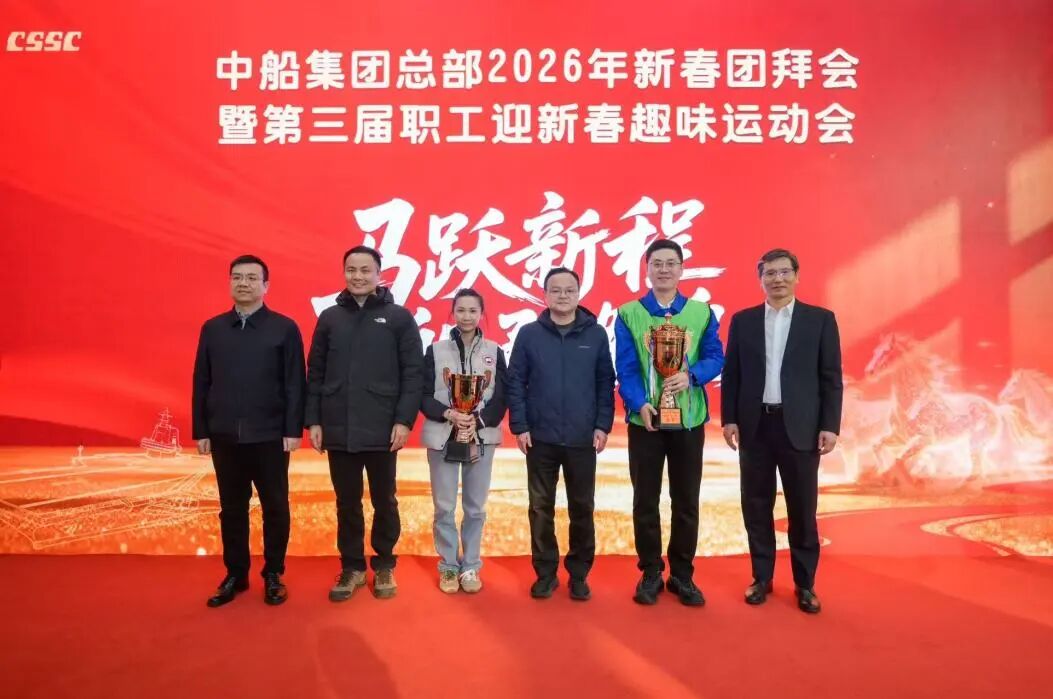 团拜会现场,集团公司领导为运动会获奖队伍代表颁奖。集团总部各部门和二级管理单位通过视频集体“云拜年”,感受属于中船人的龙马精神与团圆暖意,充分展现了中船人在“十五五”开局之年,一马当先开新局、矢志奋进建新功的昂扬风貌,凝聚起高质量建设世界一流船舶集团的磅礴力量。