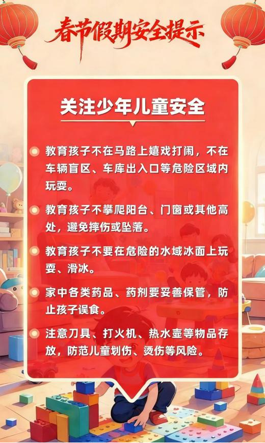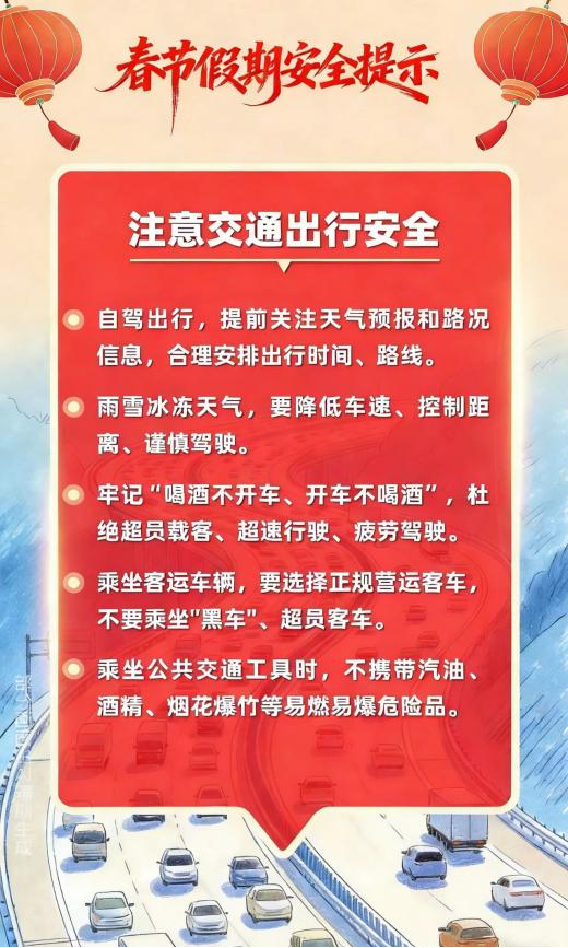 新春佳节来到 用火用气用电增加 出游、出行、运输迎来高峰 灯会、庙会、促销等大型活动多 宾馆、饭店、市场、商超等 场所人流密集 烟花爆竹产销燃放正值旺季 低温雨雪冰冻等恶劣天气多发 各类风险隐患交织叠加 安全工作须臾不可放松 这份春节假期安全提示 请查收 防风险、除隐患、遏事故 平安过春节!!!